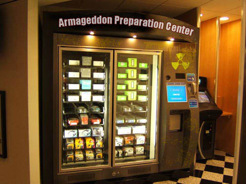 Всевозможные секты пророчат миру Армагеддон ежегодно. В конце концов, кое-кто проникнулся этой идее и решил подзаработать до предстоящего конца света, установив для этого аппараты по продаже специальных наборов для Армагеддона. Налетайте, покупайте. Реальные или поддельные?