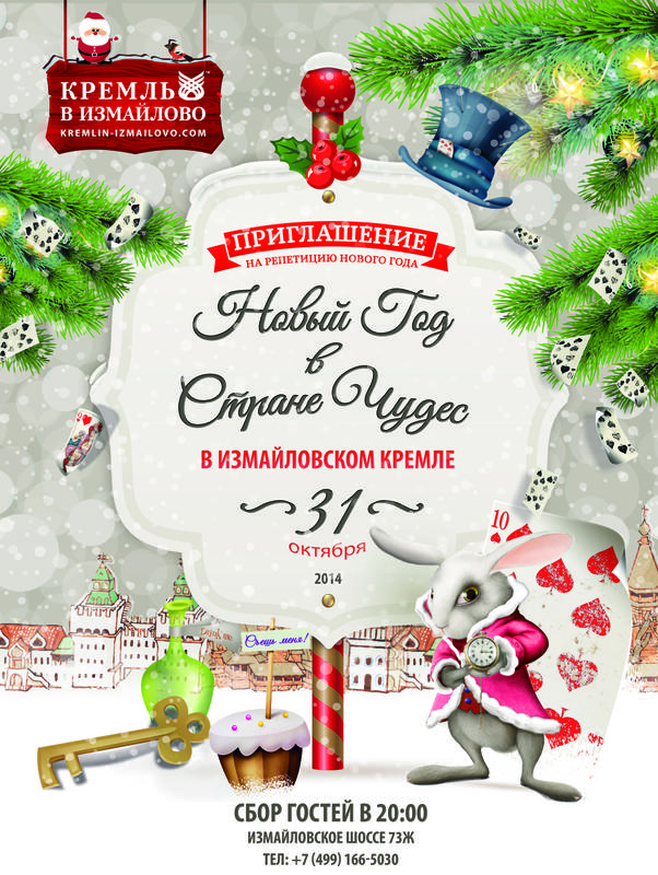 «Новый год в стране Чудес» - так звучит тема мероприятия, посвященного репетиции Нового года в культурном комплексе «Кремль в Измайлово». Встреча с волшебством ждёт не только поклонников творчества Льюиса Кэрролла, но и всех гостей вечеринки: в Welcome-зоне, расположенной в зале «Боярский», их встретит Кролик и пригласит на чаепитие с самоваром. Во время путешествия по залам страны Чудес гостям предстоит знакомство с Красной королевой и её стражей, встреча с Белой королевой и Безумным Шляпником.