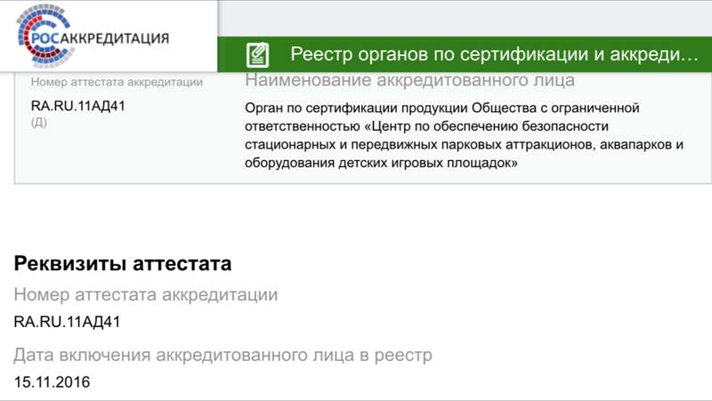"ООО "Центр по безопасности аттракционов" аккредитовал свой Орган по сертификации (ОС) в области аттракционной техники и развлекательного оборудования , аттестат аккредитации RA.RU.11АД41 и стал вторым ОС в России.