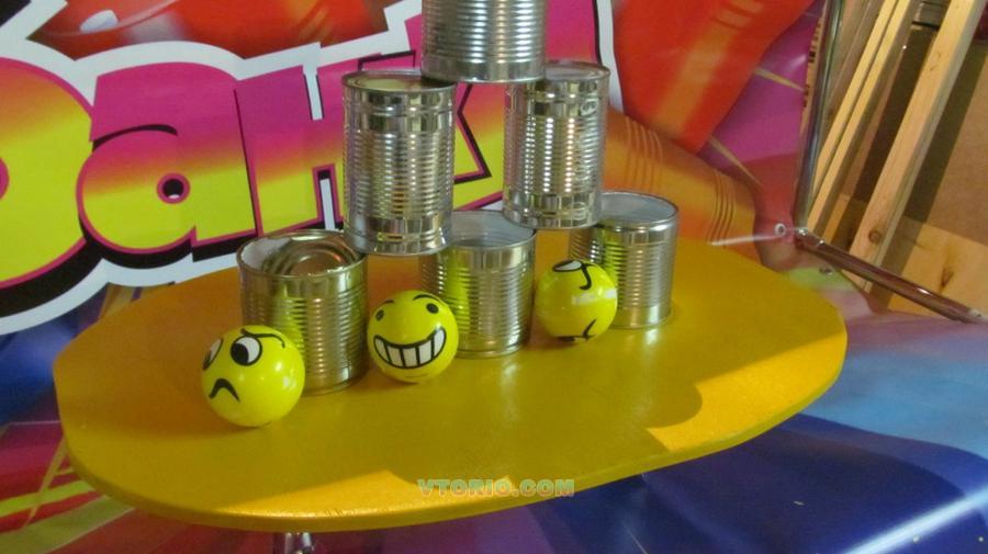 Принцип действия: играющему выдаются 3 мяча , которыми он должен выбить 5 банок на главный приз, все банки должны упасть с подставки ( приз мягкая игрушка ), меньшее количество сбитых банок сладкий приз.