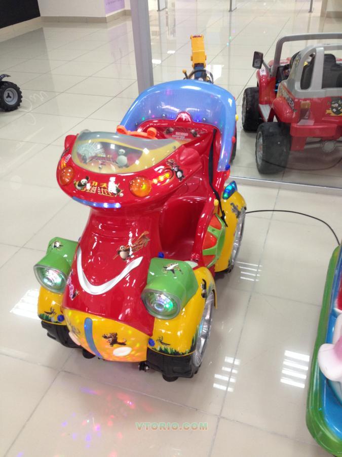 аппарат оснащен жетоноприемником, иллюминацией, музыкальным сопровождением и экраном. Позволяет закачивать собственные композиции во встроенный проигрыватель. Для этого можно воспользоваться картой памяти. Время катания регулируется от 1 м до 10м Длина 110 cм Ширина 80 см Высота 100 см Вес 60 кг