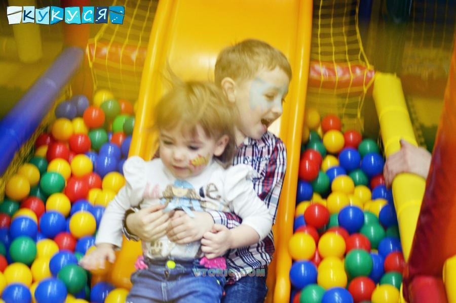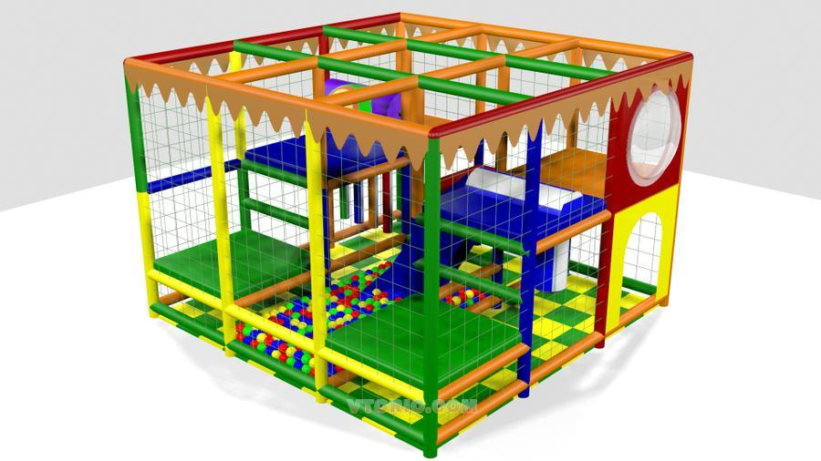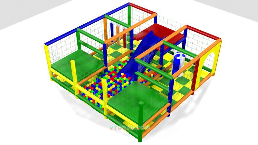 Имеет ковровое покрытие на нижнем уровне и маты на втором уровне. Оборудован пластиковой горкой, горизонтальным валиком и четырьмя боксерскими детскими грушами. В комплект входят шарики пластиковые ортопедические запаянные 1800 штук. Снаружи обтянут оградительной сеткой.