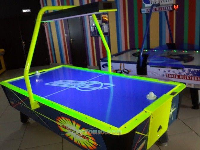 Размеры: 2530 x 1310 x 1800 Вес: 235 кг. Ультрафиолетовое покрытие игровой поверхности; Легко читаемое табло на LED дисплее, расположенное над головами игроков. На табло отражается счет игры; Скошенные бортики стола создают повышенный комфорт для игроков; Запатентованная система вентиляции Dyna-Blast обеспечивает быструю нон-стоп игру; Уникальные бортики, проверенные множеством турниров, обеспечивают точность отскока шайбы; Яркие цвета и реалистичная графика создают динамичную игровую атмосферу.
