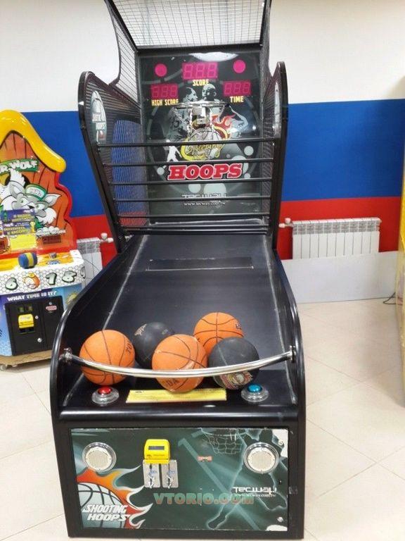Игровой аппарат имитатор уличного баскетбола Shooting Hoops . Игра сопровождается мощными звуковыми спецэффектами и яркой неоновой подсветкой. Цель- забрасывать мячи в корзину на время.