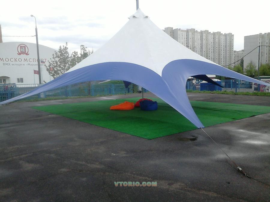 Шатер Звезда в комплекте с искусственной травой и пуфами. Расстояние от центральной опоры до края луча - 7 метров