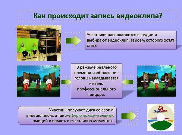 Выезд на мероприятия и съемки видео на аппарате Sugar dance. По сути - очень увлекательный процесс и уникальная идея. Клиенты снимаются на зеленом фоне. Их лица попадают в профессиональный клип в реальном времени. Сами съемки транслируются для окружающих. 1 клип записывается за 3 мин. Сразу выдается запись с диском.