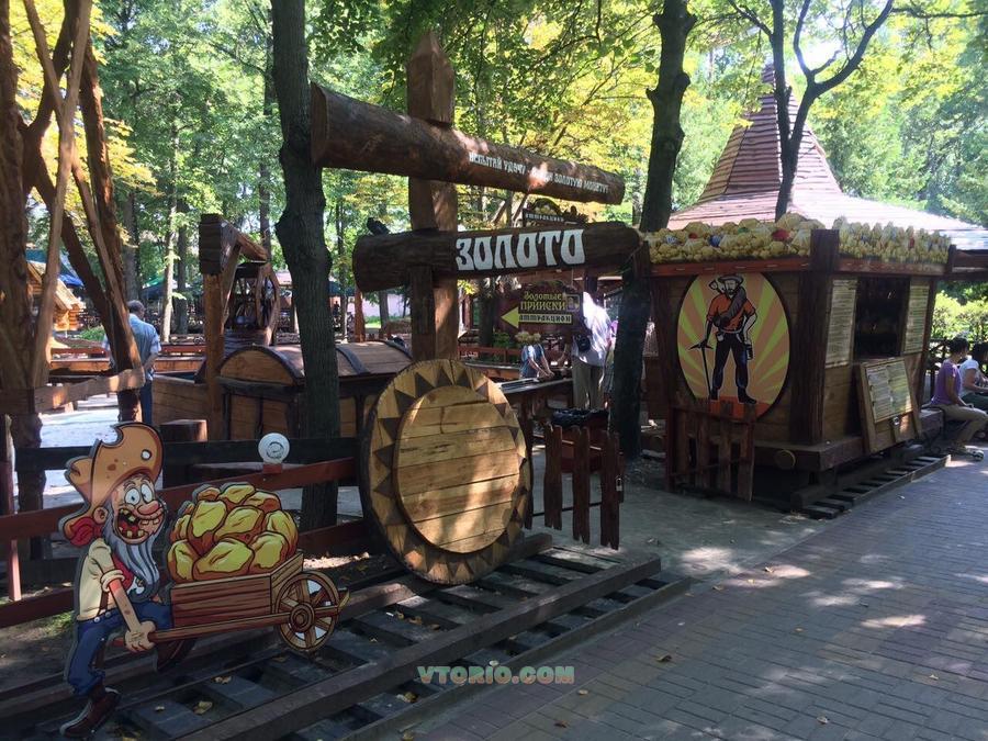 Габариты площадки – 12*12 м Состоит: 2 башни с бочками, лотки - 20м. 2 входные группы. Касса, стилизованная под вагонетку. Стилизованный железнодорожный путь. 2 лавки. Бассейн для рыб с водяной мельницей. Сундук (декарация, имеет функциональное назначение). Декорации аттракциона ручной работы, выполненные из дерева. Принцип работы - Из водонапорной башни (высота 4м) вода под воздействием течения подается в лоток, где посетители из специально подготовленного грунта при помощи лотков вымывают вручную пустую породу и добывают драгоценности. Посетители приобретают разновидность мешков с породой (песок). Вид мешков зависит от драгоценностей, которые возможно найти. Намытые драгоценности могут быть обменены на призы. Одновременное количество посетителей до 18 человек. Время намывания от 5 минут.
