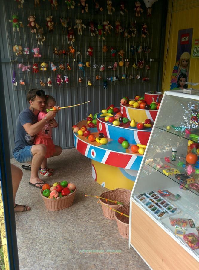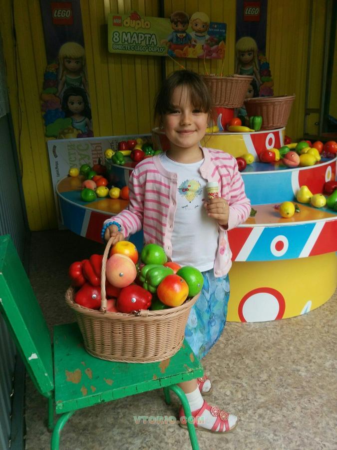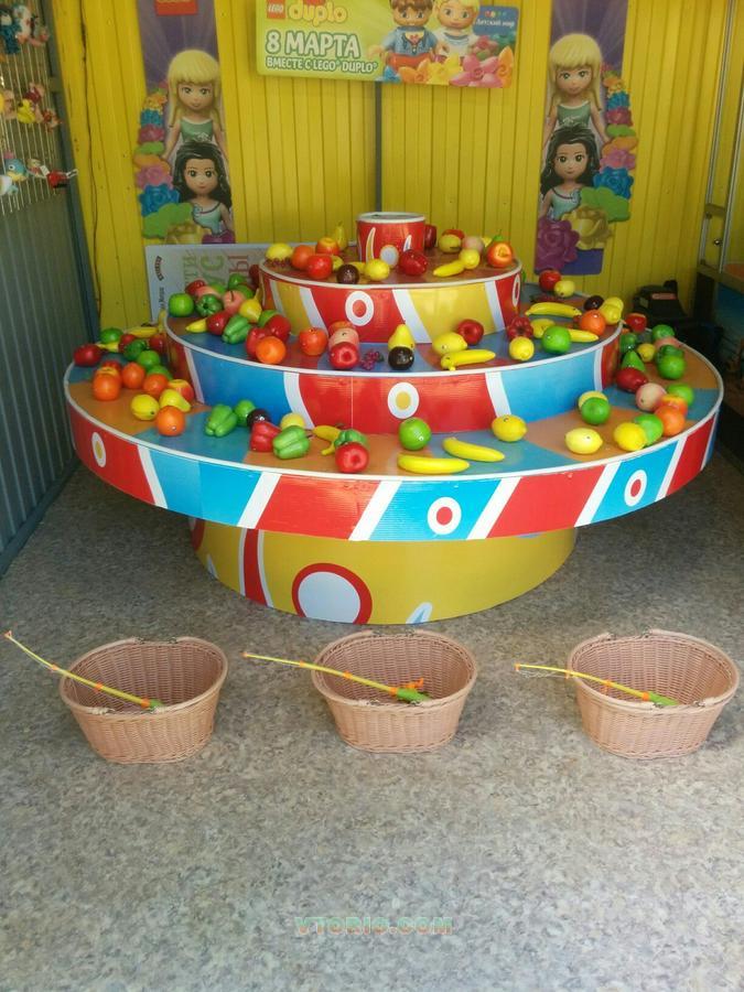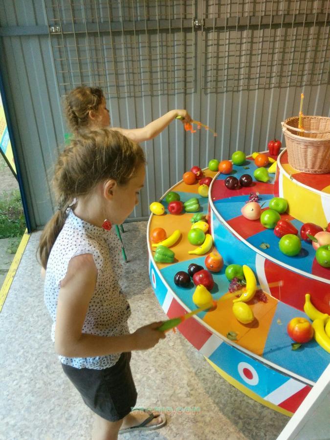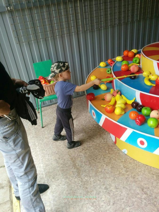 Задача ребёнка набрать удочкой полную корзинку фруктов и получить приз.