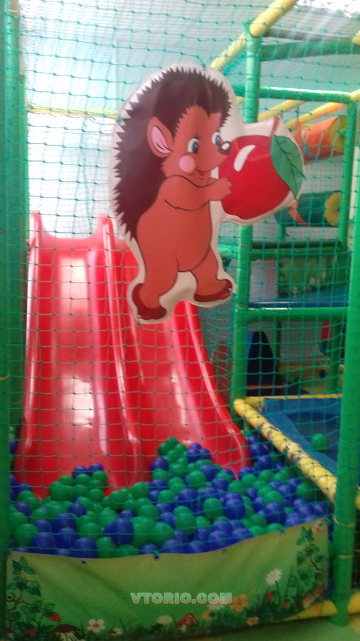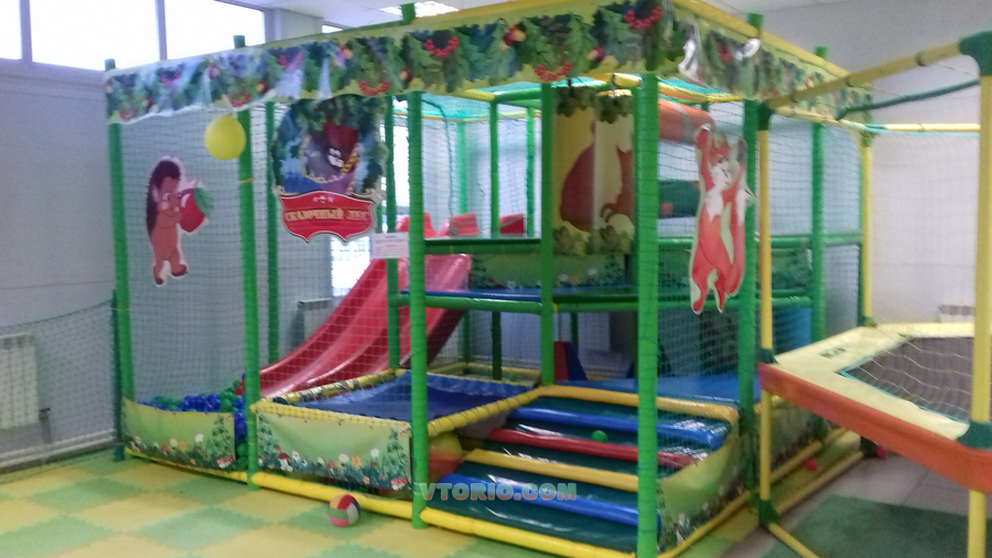 НАполнение: сухой басейн с двухскатной горкой,мягкие модули,груши, батут, мягкий пол.