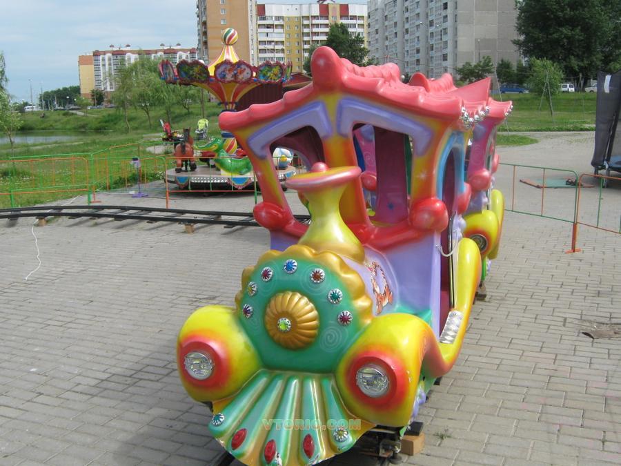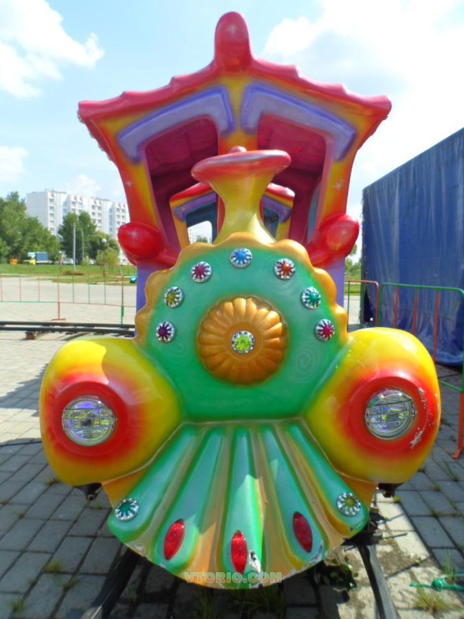 Аттракцион – «Железная дорога» представляет собой сборно-разборную конструкцию, состоящую из рельсов, лежащих на шпалах (колея 60 см); блока питания; пульта управления, паровозика с двумя посадочными местами и 2-х вагончиков по 4 посадочных места в каждом.