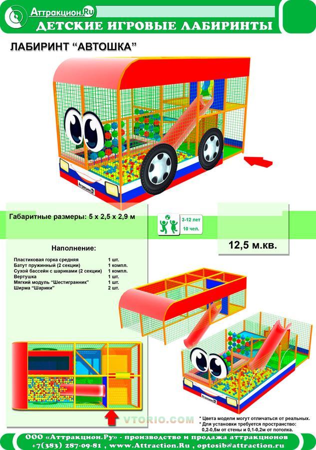 Продам аттракцион-лабиринт недорого (цена у производителя сегодня 295 000 руб). Размер: 5*2,5*2,6. Вместимость - 10 чел, возраст 3-12 лет. Симпатичный лабиринт для детей уютно устроится в вашем небольшом помещении. При компактных размерах в детском лабиринте установлена вертушка, после нее подъем на второй этаж и через мягкое кольцо выход к горке, пластиковый скат горки ведет в сухой бассейн с разноцветными шариками. Из бассейна через ширму можно выйти на спортивный пружинный батут и прыгая по сетке вернуться к подьему на второй этаж лабиринта. Внешне аттракцион украшен баннерными элементами, придающими лабиринту вид доброго автомобильчика.
