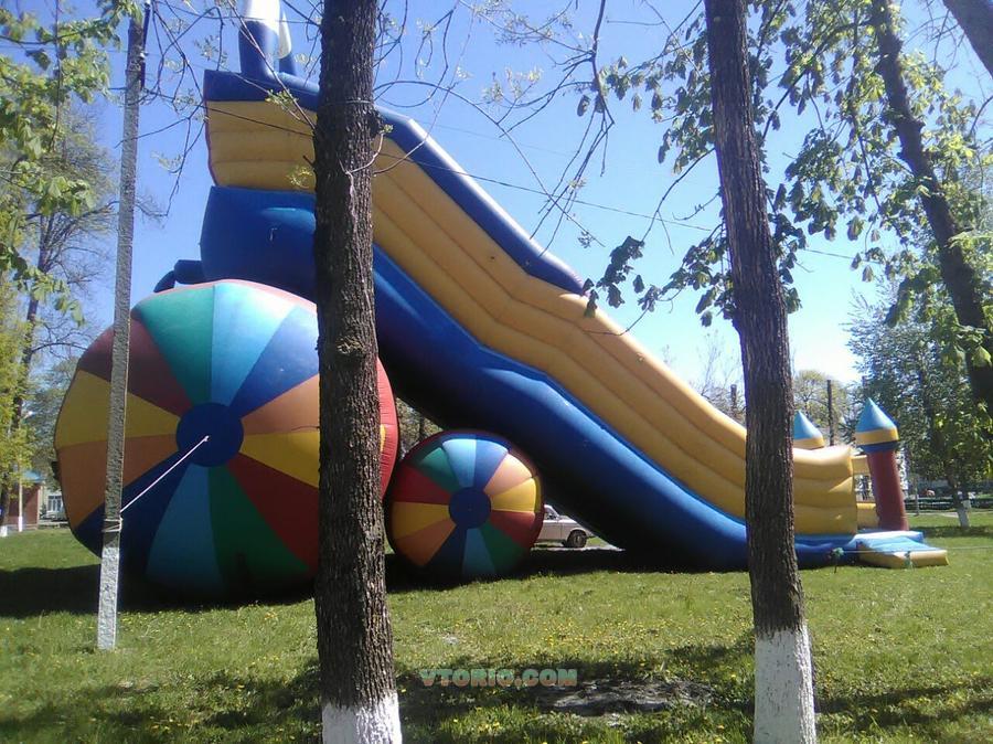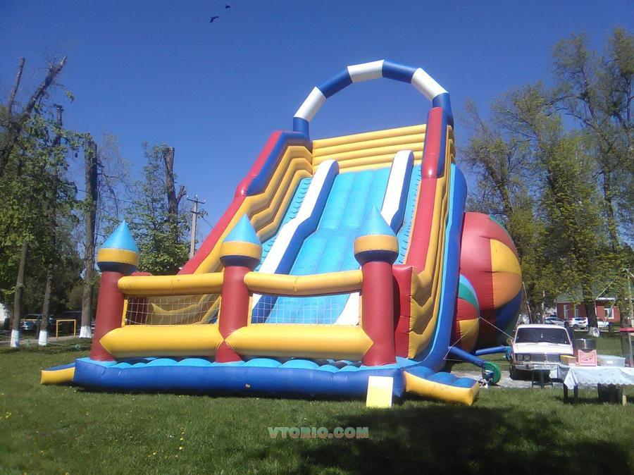 Горка, стартовая высота 8 м, длина 22, ширина 14. В рабочем состоянии, нужно сделать скат- полог. 2 нагнетателя воздуха в комплекте, состоит из 2- х частей