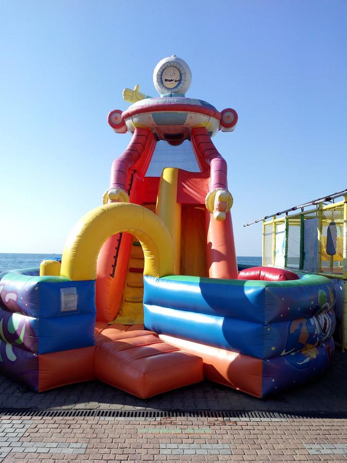 Батут "НЛО". Представляет компактную горку-лабиринт. Размеры: 6 х 7 х 5,5 м. Идеальный аттракцион для небольших площадей. Отличное качество графики (долго не выгорает на солнце) и швов. Аттракцион б/у, установлен в Сочи. Отправка в любой регион России. В комплект поставки входит: батут, 2 воздушных вентилятора, паспорт на аттракцион.