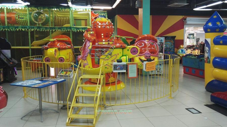 Детская карусель. Вертолёты вращаются по кругу. Аттракцион предназначен для развлечения и активного отдыха детей от 3 до 7 лет( весом не более 40 кг). Возможность катания до 8 детей. Яркий дизайн и веселое музыкальное сопровождение делает аттракцион очень привлекательным и популярным у малышей. Аттракцион запускается с пульта управления. Ширина 6,5 м. Глубина 6,5 м. Высота 2,2 м. Напряжение питания 220 В. Мощность 850 Вт. Вес 1200 кг.