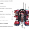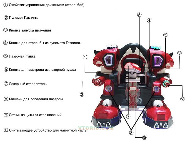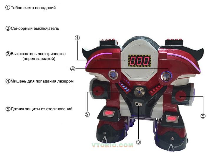 Два вида оружия – пулемёты (имитация), лазерная пушка. С другими роботами играет в "Битву Роботов". На корпусе сенсорные мишени, количество попаданий фиксируется на дисплее на спине робота.