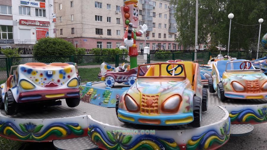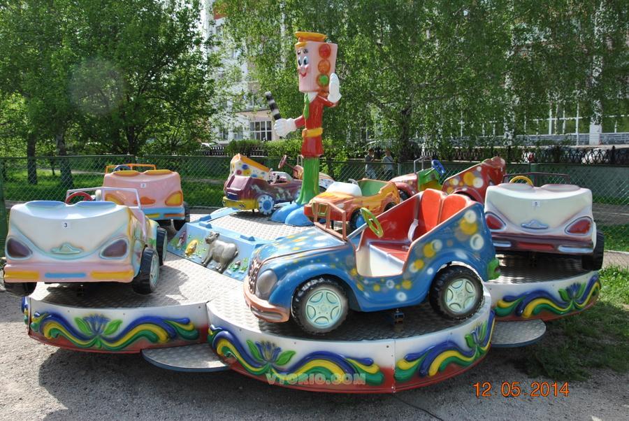 Красочная вращающаяся платформа с волнообразным круговым движением и вращением 6-ти двухместных кабинок-автомобилей при качении движущейся платформы вокруг своей оси за счет эксцентриситете. Характеристики аттракциона: Род тока питающей сети - переменный, трехфазный; Частота переменного тока, Гц -50 +_1; Напряжение питания, В: силовых цепей -380 ± 10 %; цепей иллюминации -12 ± 5 %; 380 ± 10%; Расход электроэнергии (по циклу), кВт.ч не более -100 Вт; Установленная мощность двигателя привода движения, кВт не более –1,5; Количество двигателей, шт. -1 Тип двигателя Количество оборотов ротора двигателя, об/мин -1430; Продолжительность цикла катания, мин более 2; Количество кабин, шт. – 6; Количество посадочных мест общее, шт. – 12; Частота вращения платформы, об/мин - 8; Площадь, занимаемая аттракционом, м2 не более - 30; Габаритные размеры аттракциона, м не более: Высота - 2,5; Диаметр по ограждению - 7,5; Масса аттракциона, кг, не более - 600.