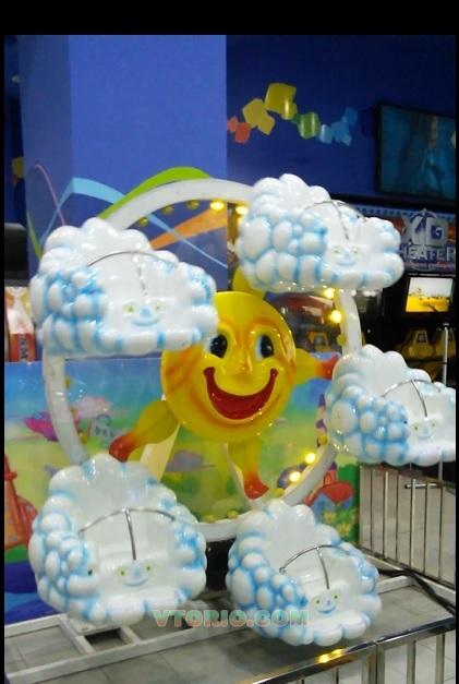 Карусель с музыкальным сопровождением. Яркое красочное облачко-карусель. Небольшая высота и площадь позволяют использовать в небольших помещениях. Аттракцион - колесо обозрения, уменьшенного размера. Специально разработан для ДРЦ с малой высотой потолка. Оснащен яркой иллюминацией. 5 кабинок, 5 посадочных мест. Не использовать на улице при температуре ниже 20°.