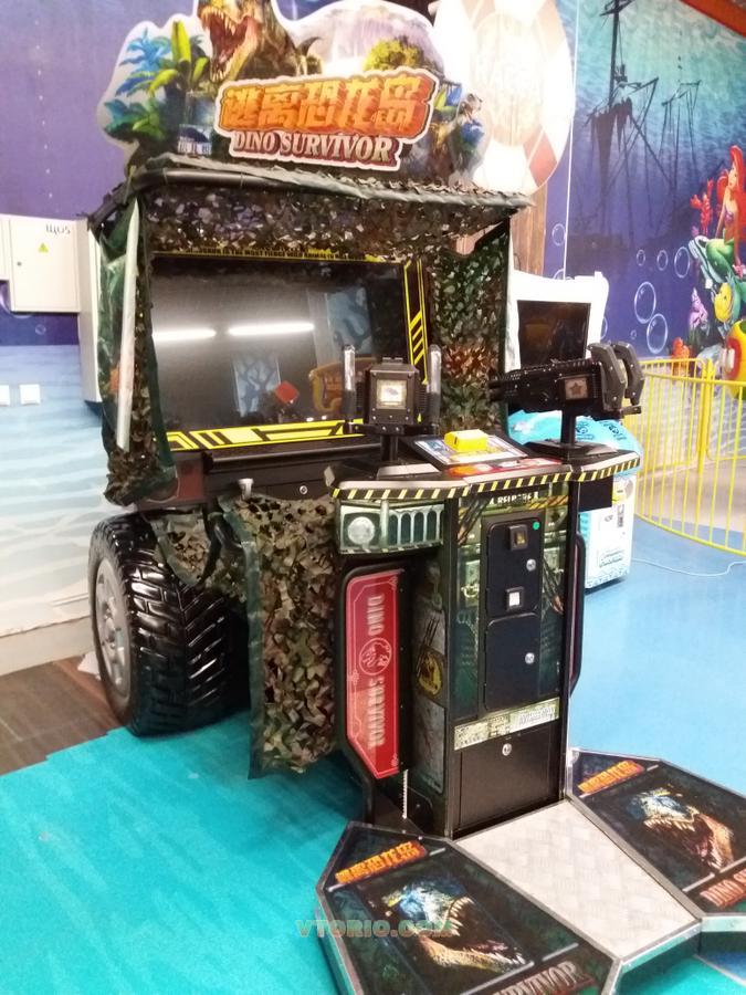 Особенность видеосимулятора-3D стереосистема. Игроки, при помощи оружия, охотятся на динозавров