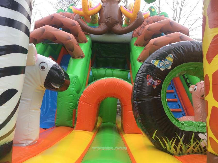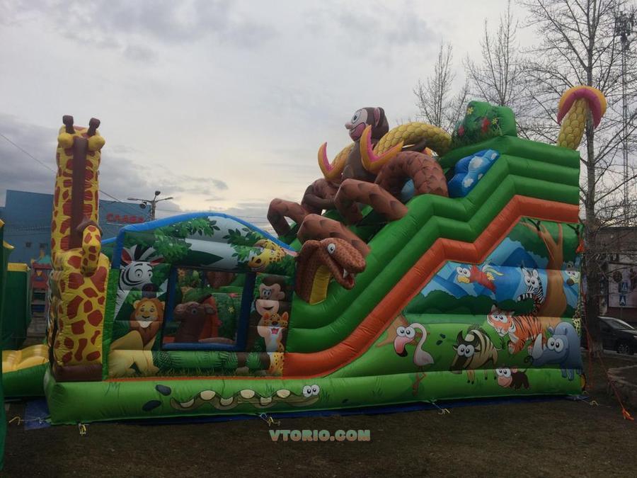 Элементы Батута - горка, место для бега, место для прыжков, препятствия, туннель, фигуры игровые. Размеры 9 × 5.2 × 7 м. Материал ПВХ PLATO: толщина 0,55 мм, вес 690 гр/м2, плетение 1000 ден, не горит, не выцветает. сертификат, паспорт по ГОСТ Вместимость 15 Высота горки 3.5 м Вес 290 кг.