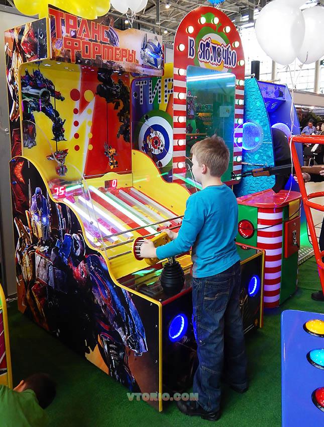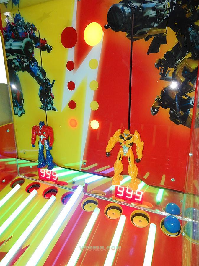 Аттракцион "Трансформеры" оборудован двумя воздушными пушками и поэтому он чем-то напоминает воздушный тир! Играть можно как в одиночку, так и вдвоем. Управляя воздушными пушками, струей воздуха, нужно закатывать шарики в лузы. У каждого игрока по 4 лузы. После того как в каждую лузу попадет по одному шарику игрок заработает очки, а робот-трансформер, за которого он играет, поднимается на одно деление. Всего нужно пройти 5 этапов за отведенное время, чтобы выиграть главный приз.