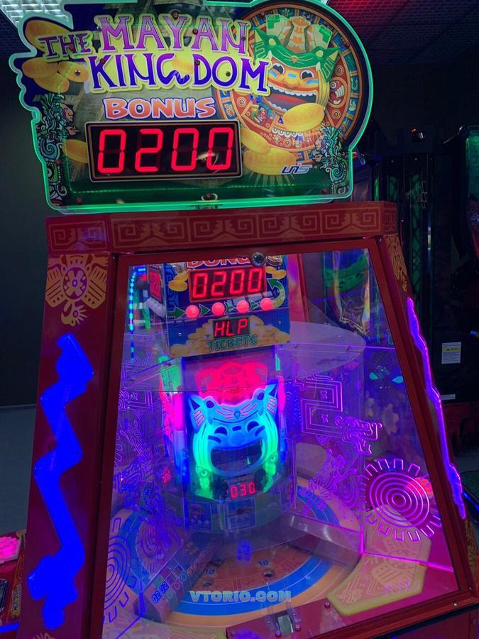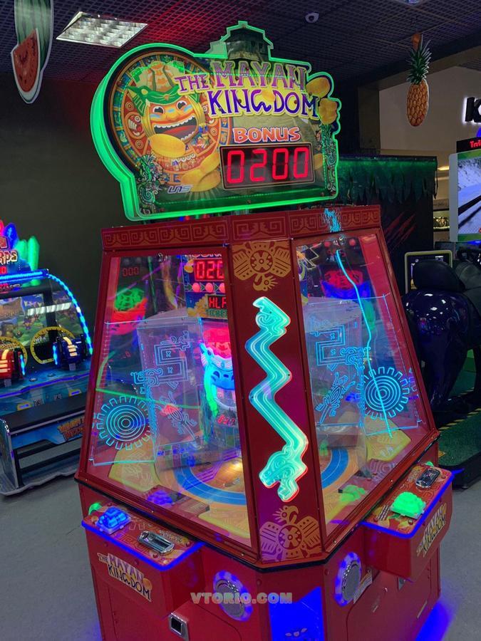 Пушер для 4-х игроков. Задача игроков столкнуть жетон в уста Короля Майя. Вращающееся игровое поле усеяно отверстиями с различным значением призовых очков. Необходимо умело прицелиться, чтобы попасть в желаемую мишень. Хорошо продуманный дизайн: яркая светодиодная подсветка всех 4-х сторон, вращающийся купол. По результатам игры, в зависимости от количества набранных очков, игрок получает призовые билетики. Производитель: UNIS Год выпуска: 2017 Высота: 240 см Ширина: 140 см Глубина: 140 см Возраст: От 7