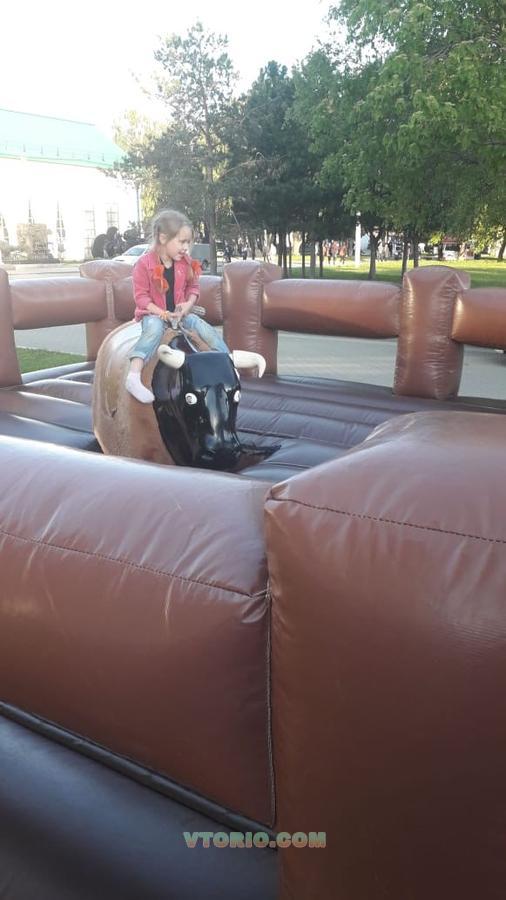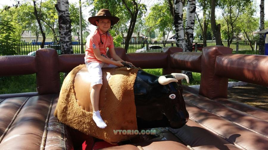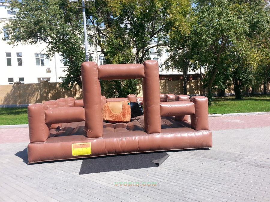 Механический бык с надувным матом, оснащенный вентилятором и рекомендуется для детей старше 8 лет и взрослых. Аттракцион может помещаться на открытом воздухе и в помещении. Работали с ним на выездах - летом, зимой работал в помещении, выезжали на корпоративы (в час 3000 рублей). Пользуется большим спросом. Стоимость от 150 до 250 рублей, в зависимости от мероприятия и города - игра: до 3 падений, но не более 7 минут. Проходимость до 20 человек в час. Рабочее напряжение 220 в, 9-60 об/мин Мощность 3 000 - 3 500 Вт Занимаемая площадь 25 кв.м (надувной мат 5*5 м) Механический бык разделен на два режима работы: автоматический и ручной (9 скоростей) Часы снабжены светодиодной подсветкой Комплектация: Надувная подушка 1 шт. Пирамида-привод 1 шт. Рубчатые рамы 4 шт. Вентилятор, нагнетающий механизм 1 шт. Пульт управления 1 шт. Насадка в виде фигуры быка 1 шт