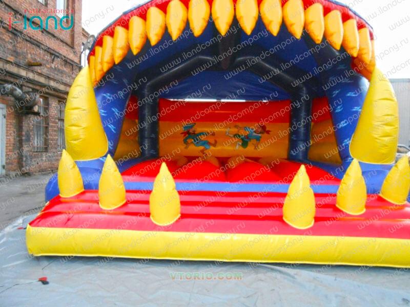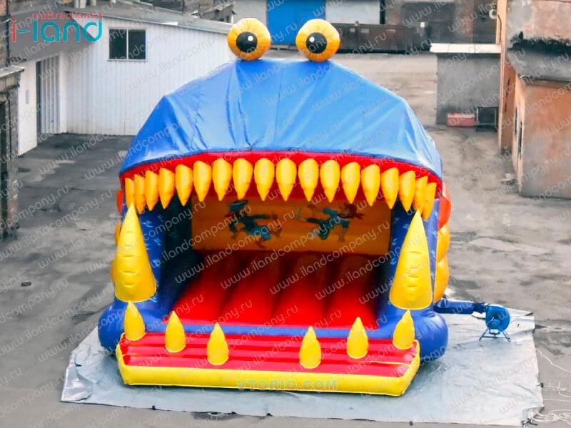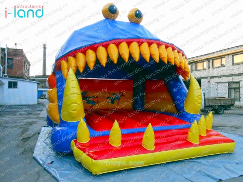 Батут выполнен в форме большого персонажа с огромными зубами, которые смыкаются при нахождении внутри людей. Каждому захочется побывать в его пасти! Также, игровая площадка батута хорошо просматривается с улице