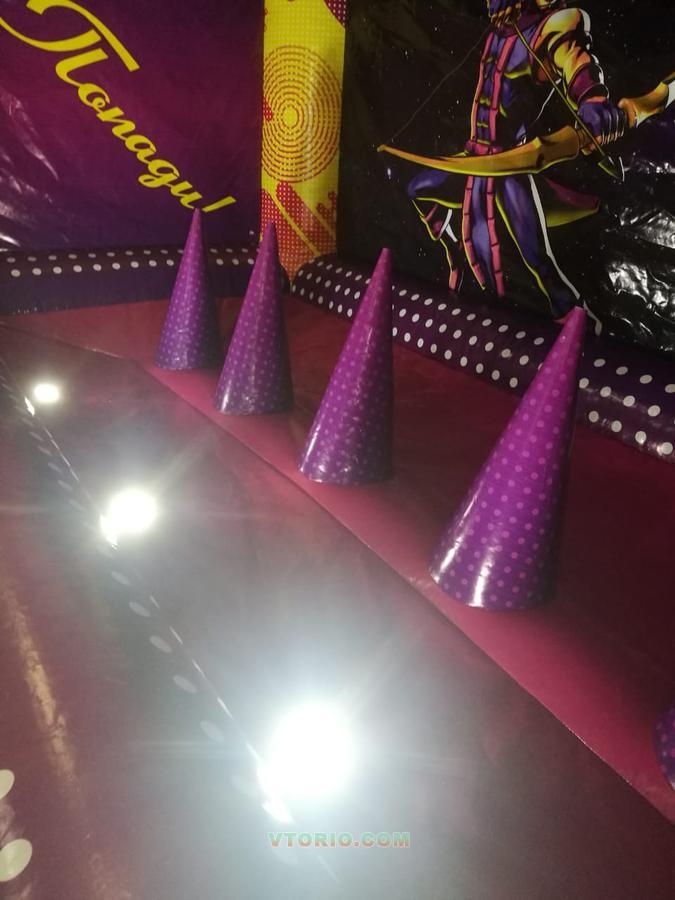 В комплектацию входит: - тир - 3 лука ( детский и взрослые) -бластер - стрелы с мягкими наконечниками 10 шт. - чехол для тира - 10 шаров ( чехол для шаров). - воздуходувка - документы на аттракцион