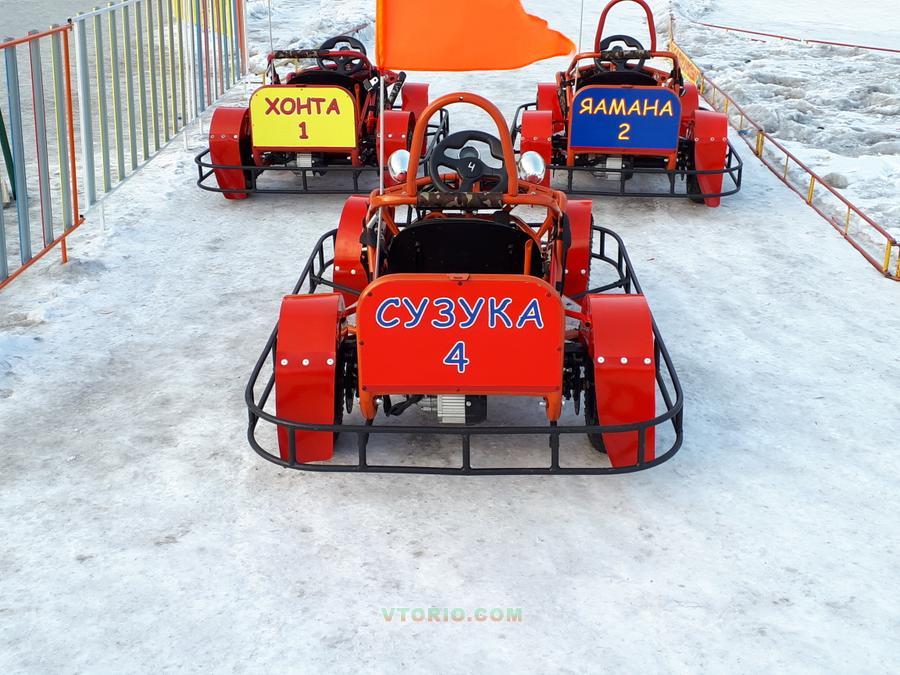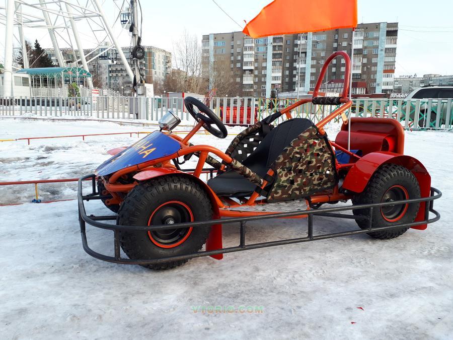 Сделаны улучшения для удобства в прокате: крылья перед, зад с брызговиками (гонять можно по лужам и оставаться сухим), на сидении утеплители быстросъемные, спереди и сзади красочные номера, акб быстросъемные (очень удобно в прокате когда много посетителей можно быстро заменить), быстрая регулировка сидения с фиксацией как на Тойоте, отбойник по периметру (убережет машину при столкновениях). Ограничитель скорости перенесён для удобства оператора-инструктора. Техника проверенная временем и летом и зимой, никогда не подводила. Зимой спрос больше, кататься по снегу с управляемыми заносами интересней. Зимой едут по сугробу 10 см, гребет отлично, высокая зимняя резина с проректором 1.5 см. справляется на ура. Резина зимняя как новая, летняя спереди износ 30% сзади меньше (резина качественная). На фото без акб. Опыт работы с такой техникой третий год, поделюсь с покупателем всеми тонкостями.