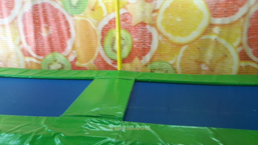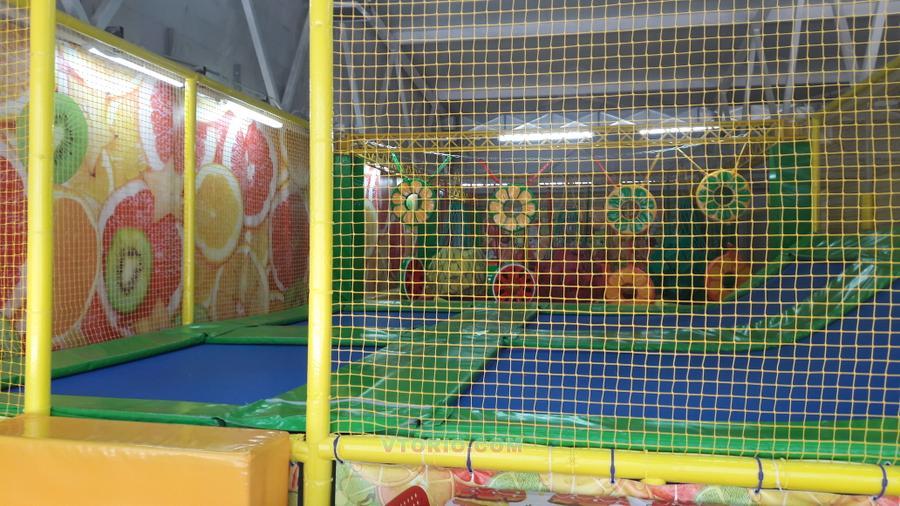 Размер 16м×5.6м, высота 2.5 м. Вместимость 22 человека. Комплектация 4 батута, 6 препятствий и скаладром, поролонновые кубики.