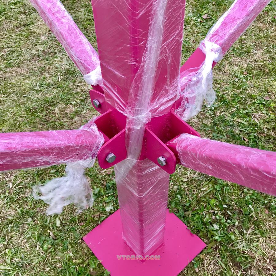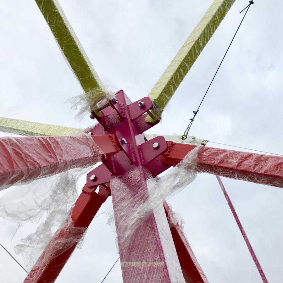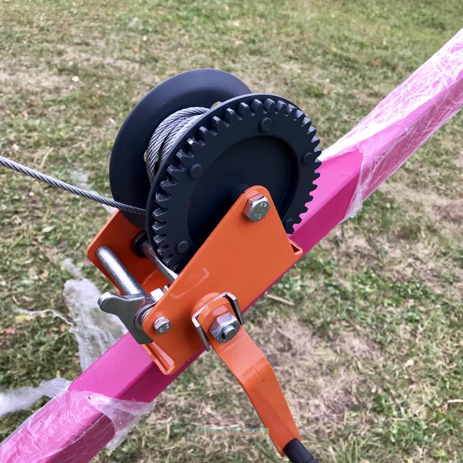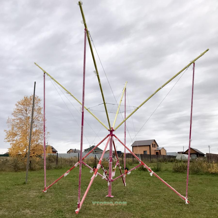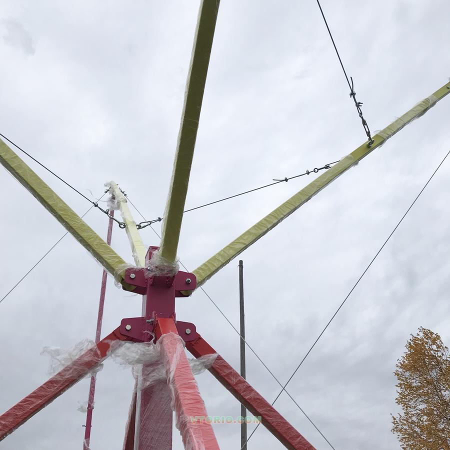 Общая высота аттракциона 6 м, площадка под установку 7м, максимальная длинна детали 2,6м. Регулируемые лапы и тросы, чтобы Тарзанка вставала без нареканий на неровностях.