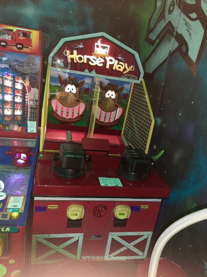 Забавная игра - стрельба по лошадиным зубам. Игрок стреляет резиновыми мячиками из пневматической пушки