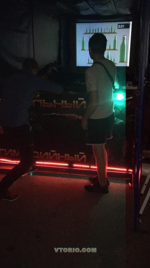 Тир сделан на базе прицепа(2.5м длина): сенсорный экран (2*1.5м) прикреплён к стенке прицепа, а от прицепа собирается палатка.(в собранном виде тир 2,5 на 7м, всё помещается в прицеп, что делает Тир мобильным и более прибыльным).