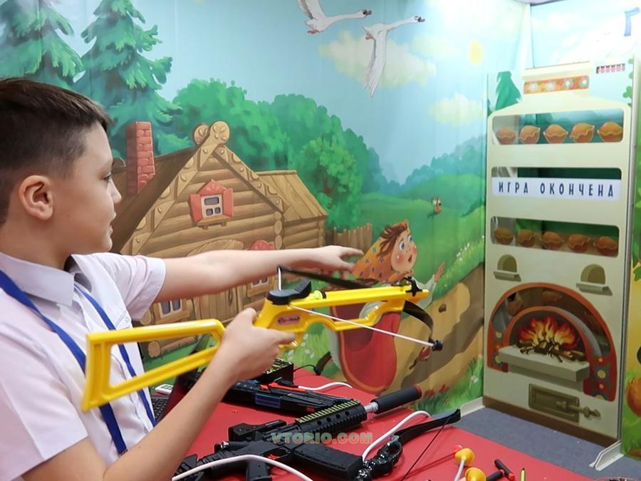 Детвора стреляет из детского лука и арбалета, целится из пистолета NERF, сбивает цели мячом и даже лупит из рогатки красной фасолью. Оружие игрушечное и абсолютно безопасное.