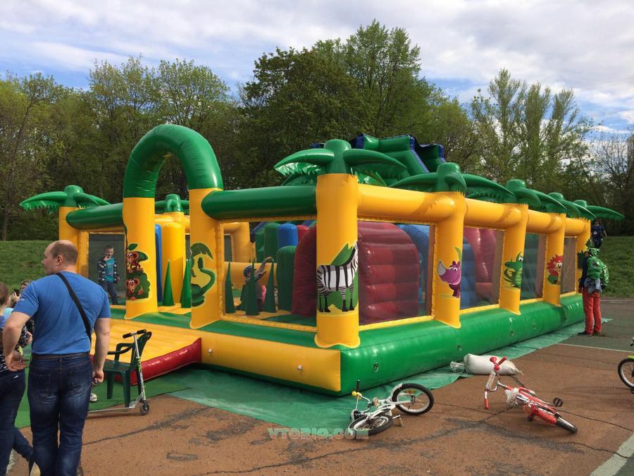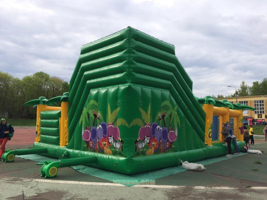 Состояние НОВОГО. Отработал 1 сезон (бережная эксплуатация и хранение) Плотность ПВХ мат-ла: 650/680 гр/м2. Разм.: 11*7,5*6,5 м Компл.: нагнетатели 2*1,5кВт,подложка,чехол-сумка,Рем.комплект,паспорт изделия,Сертификат,Декларация. Наполнен оригинал.фигурами, есть горка h=4,5 м! Одновременно до 12 детей (разного возраста) Цвета яркие, надежный и долговечный материал, не боится мороза.