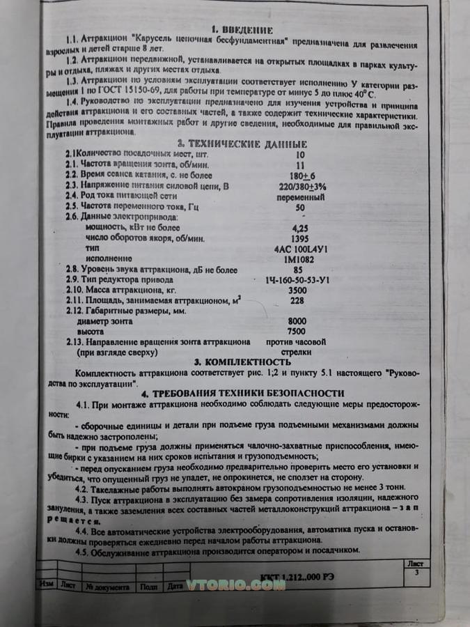 Аттракцион "Цепочная карусель бесфундаментная" Производство - Россия, Краснодар, "Культехника" Год выпуска - 2001 Состояние - отличное Размеры: Диаметр, мм - 8000 Высота,мм - 7500 Диаметр по ограждению,мм - 18000 Количество мест, шт. - 10 Частота вращения, об/мин - 11 Цикл катания, с не более - 180 Площадь, м3 - 228 Напряжение, В - 220/380 Мощность, кВт - 5 Масса, кг - 3500 Транспорт - одна еврофура !В комплекте ограждение!