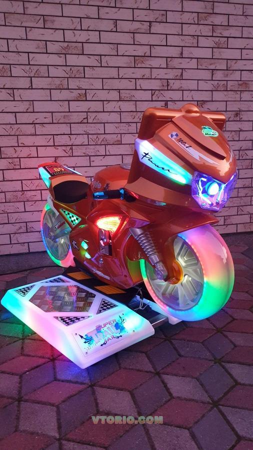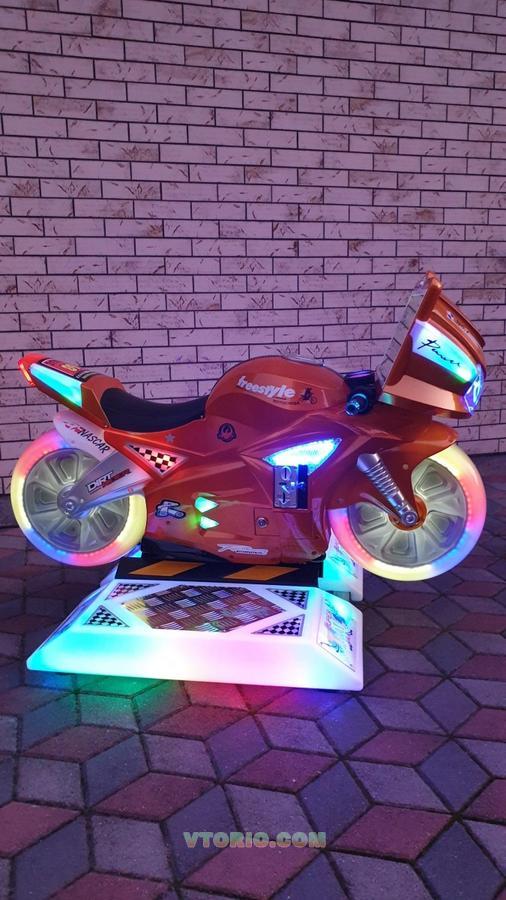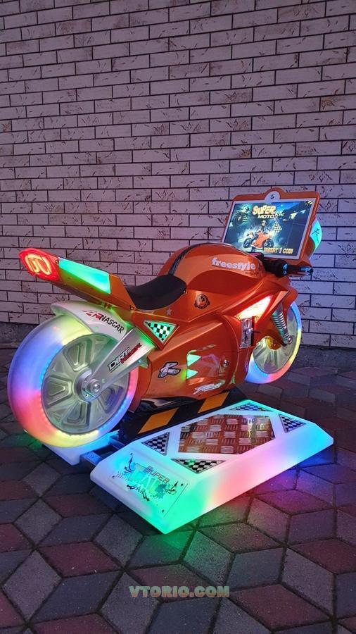 Производителем продумана каждая деталь симулятора: ручка газа добавляет в игре скорости мотоциклу, а ручка тормоза останавливает в игре мотоцикл, а наклонами влево-вправо игрок управляет поворотами мотоцикла. Реализованы, хорошая графика в игре, красивая и привлекательная подсветка мотоцикла. Есть встроенный монетоприемник, который хорошо работает с монетами или с жетонами. Установлена важнейшая функция: в каждом мотосимуляторе есть встроенный передатчик, с помощью которого можно соединить два и более таких мотоциклов единую сеть и устраивать азартные соревнования среди мотогонщиков !