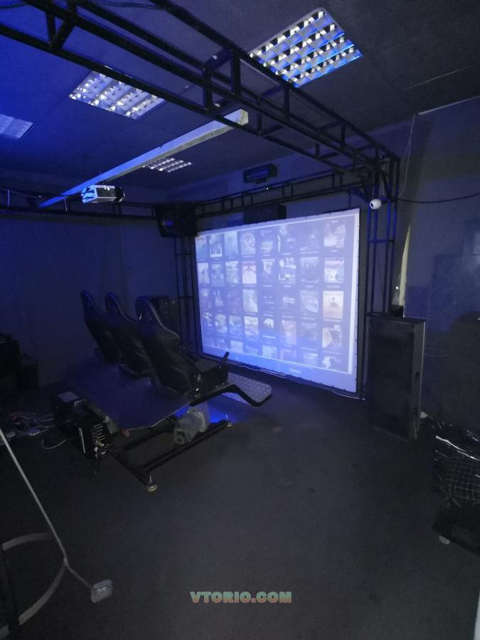 Уникальный аттракцион последнего поколения. Подвижная платформа с тремя степенями свободы и встроенными спецэффектами: дождя, брызг и мышиных хвостов, оснащенная шлемами виртуальной реальности oculus riftdk2. Шлем позволяет просматривать ролики на 360 градусов. Также более 170 роликов на обычном экране