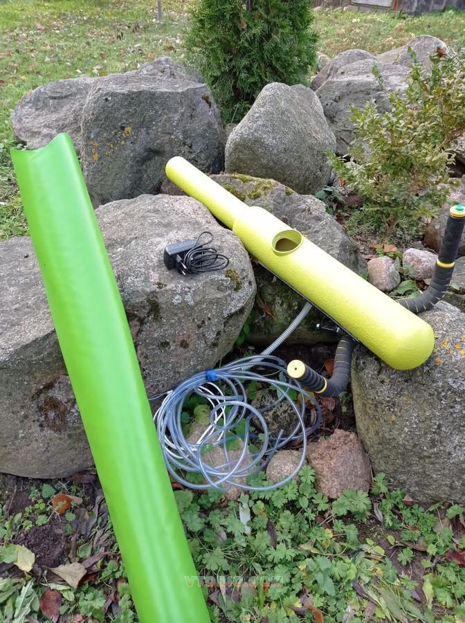 Пневматическая пушка, работает в паре с компрессором. Рабочее давление 6-8 кг/см. 2, дальность максимальная 9 метров. Корпус пластик.