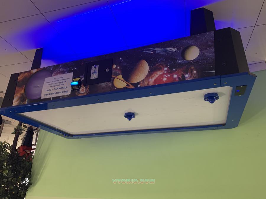 Автомат фактически проработал 2 месяца, после чего был вывезен в гараж. Внешнее оформление стола "Космос". Дополнительно была заказана диодная подсветка "в пол". Всё программируется/светится/играется и т.д. Обе биты и две шайбы в комплекте.