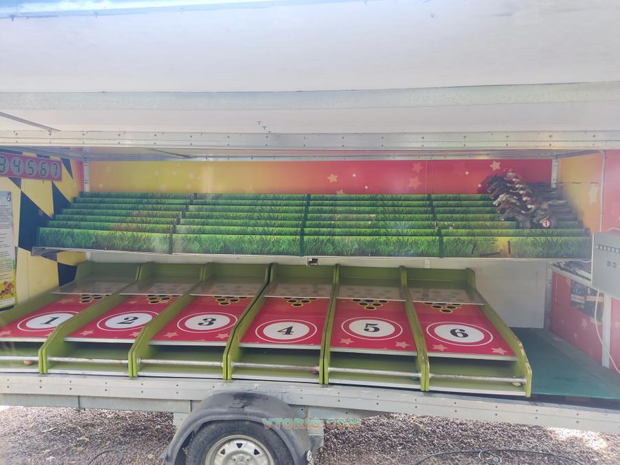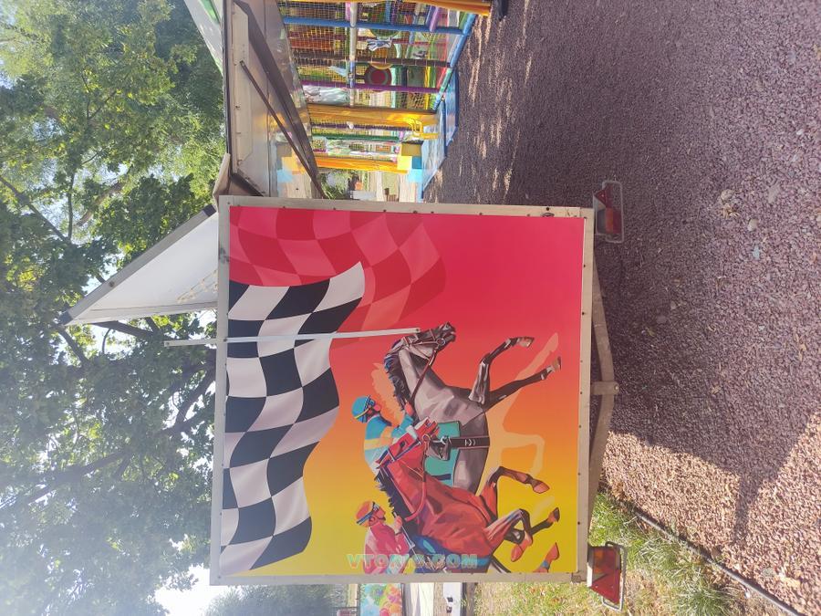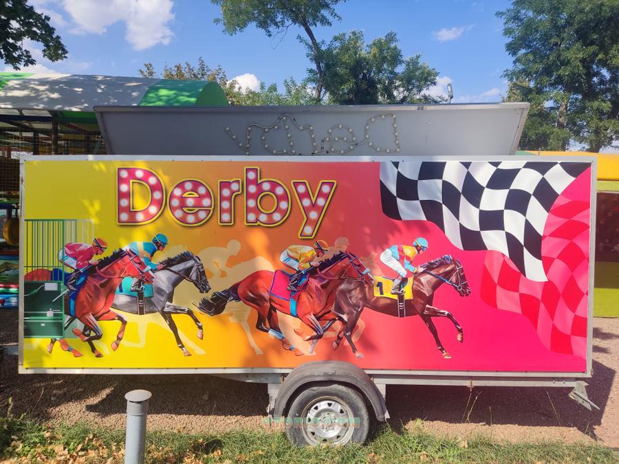 Продаётся аттракцион Дерби. Правила игры: В игре участвует от 2 до 7 игроков одновременно. Каждому игроку выдается по одному шарику. После объявления о начале игры Игроки начинают катить шарики по игровому полю. На игровом поле размещено 16 лунок трех цветов (красный, зеленый и желтый). Попадая в красную лунку фигурка лошади (возможны другие персонажи) делает по беговой дорожке три шага, попадая в зеленую лунку - лошадь делает два шага по беговой дорожке, попадая в желтую лунку - лошадь делает один шаг по беговой дорожке. Как только шарик попадает в лунку он возвращается игроку автоматически и игрок снова катит шарик. Игра продолжается до тех пор, пока чья либо лошадь не добежит до финиша.