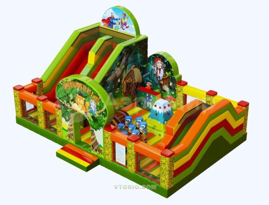 Детский надувной батут «Лукоморье» - игровой комплекс, созданный в тематике одноименной сказки «Лукоморье». Функциональность аттракциона включает горки смешанной высоты, отдельно размещенные для безопасного катания малышей и детей постарше. Помимо горок, на игровом центре спроектирован прыжковый участок, расположенный отдельно между спусками. На котором установлены объемные фигуры - скалодром, два элемента препятствий и туннель. Таким образом, дети, катающиеся с горок не мешают играющим на прыжковом участке и наоборот, так достигается безопасность проведения игр на аттракционе. Помимо функциональной части - аттракцион продуман технически: безопасные ступеньки и плавный спуск горок, достаточная зона торможения после спусков, заграждения в рост человека и сетки для внешнего контроля за поведением детей Высота горки от уровня пола, м: 1-я горка: 3 м; 2-я горка: 1,5 м Материал: высокопрочная, цветостойкая ткань плотностью 650 — 690 г/м² ПВХ; огнеупорная, отлично держит воздух и форму батута, легко моется, обеспечивая долгий срок службы изделия. Вместимость 18-25 человек, максимальная нагрузка 770 кг. Комплектация: - оболочка - вентиляторы (энергосберегающие) - сумка-чехол - образцы для ремонта - паспорт- паспорт