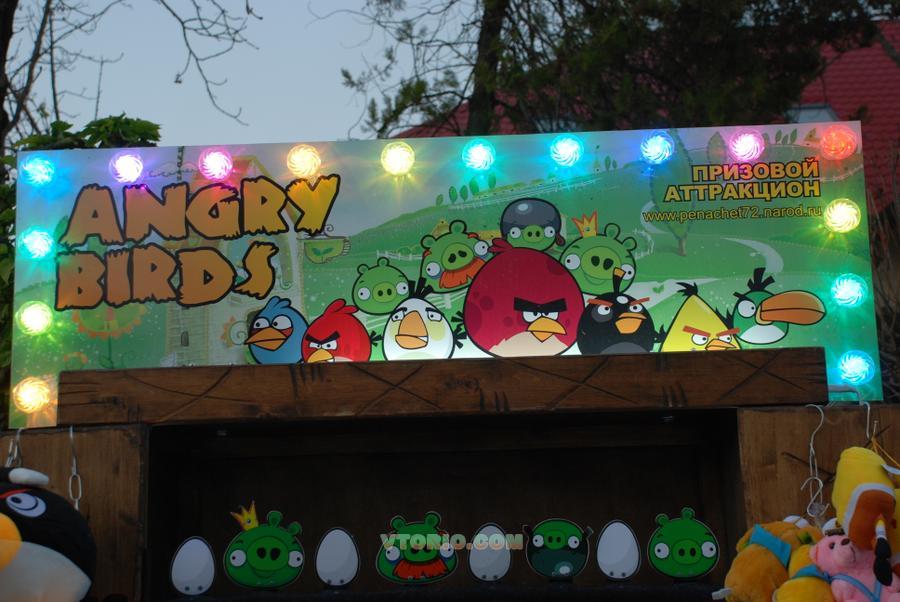 Аттракцион начал тестирование осенью 2012г. в городах и станицах Краснодарского края. Аттракцион на 1 человек. Показал результаты валового дохода 8000-17000р. за вечер на день города или станицы. Принцип игры прост: Игрок с помощью четырех мягких "Злобных птичек" пытается сбить 4 свинок которые yкрали яйца птиц из гнезда, сбить нужно только свинок не задев при этом яйца птиц, приз в любом случае, размер приза зависит от чистоты попаданий. Попав хотя бы в одно яйцо игрок yже не может претендовать на большой приз. Расстояние броска вы регулируете сами как впрочем, и количество бросков. Игра построена на чистом везении. Попасть в свинок не сложно, но может далеко не каждый.