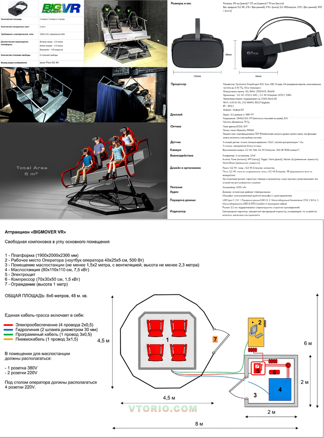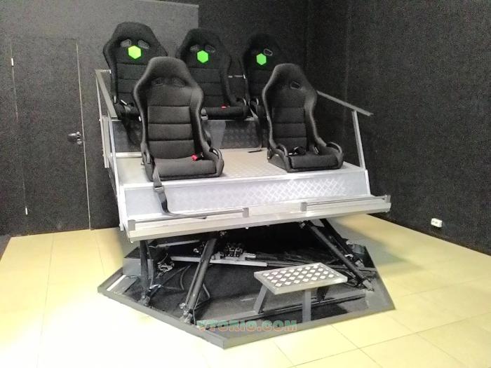 Аттракцион работает на гидравлической шестиступенной динамической платформе.