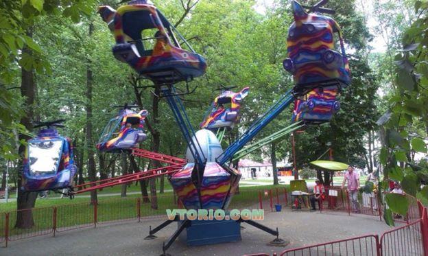 АТТРАКЦИОН «Вертолеты»» ОСНОВНЫЕ ТЕХНИЧЕСКИЕ ПАРАМЕТРЫ - Количество посадочных мест – 12 - Количество кабин 6 - Максимальная нагрузка на кабину- 90кг. - Скорость вращения вращения посадочного модуля – 2,83м/с оборотов в минуту - Высота подъема – 2,4м. - Приводы – электрический на вращение, гидравлический на штанги. - Электроснабжение – 220/380 50Гц - Установленная мощность 8,2кВт - Габаритные размеры – дина 8,4м, ширина 8,4м, высота 3,5м - Площадь, занимаемая качелями – 102м. кв. - Вес качелей – 2,8т