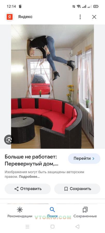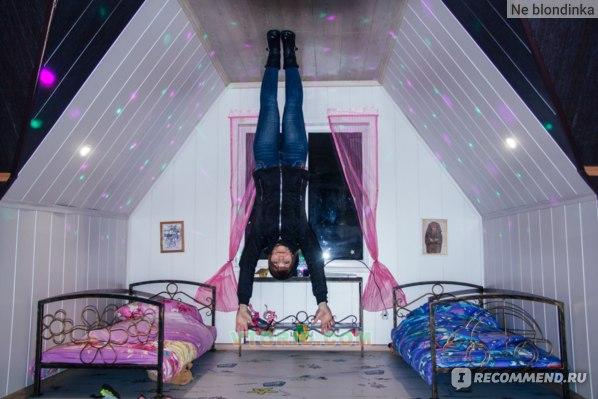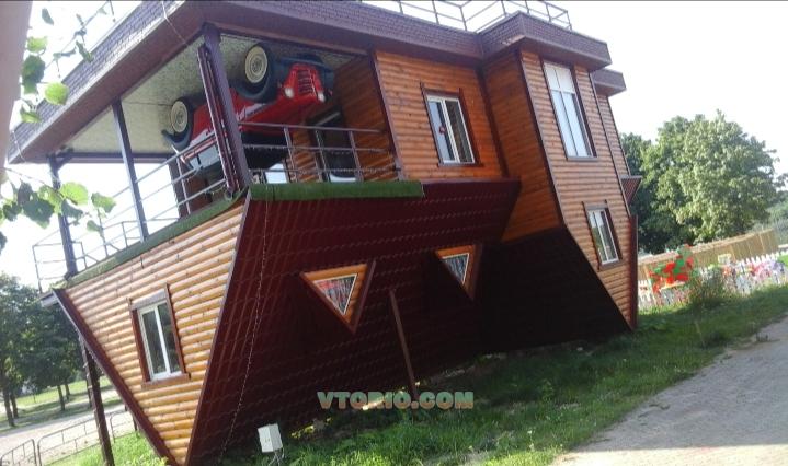 В доме есть всё необходимое, чтобы картина представилась максимально реалистично - под ногами потолок, а над тобой "нависает" мебель, посуда и другие предметы быта, есть прикреплённый над входом автомобиль 1956 года, автомобиль специально оборудован под проект. Аттракцион идеальный объект для интересного времяпровождения, селфи, квестов и т.д, предназначен для детей от 2-х лет и взрослых.