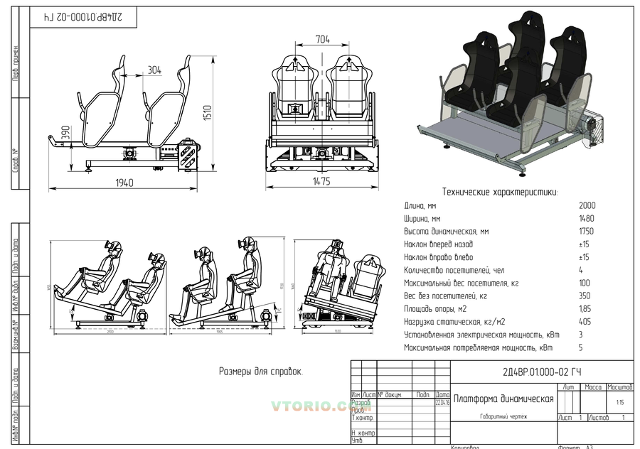 Длина - 2000 мм Ширина - мм 1480 Высота динамическая - 1750мм Наклон вперед-назад ±15º Наклон вправо-влево ±15º Количество посетителей - 4 чел Максимальный вес посетителя - 100 кг Вес без посетителей - 350 кг Площадь опоры - 1,85 м2 Нагрузка статическая - 405 кг/м2 Установленная электрическая мощность - 3 кВт Максимальная потребляемая мощность - 5 кВт