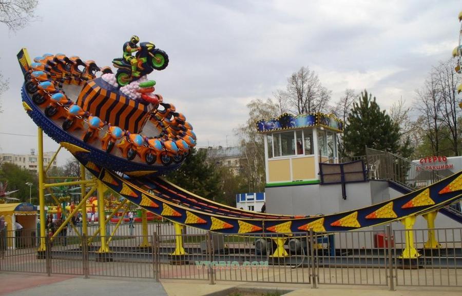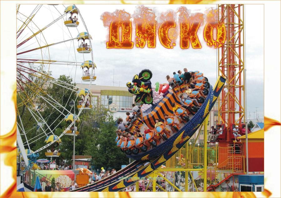 Аттракцион «Диско» представляет собой большой круглый диск, вдоль края, которого размещены 24 посадочных места, оформленных в виде мотоциклов. Диск приводится в движение с помощью приводного устройства и вращается как в прямом, так и обратном направлениях. Одновременно с вращением, диск еще и раскачивается на рельсах, и благодаря сочетанию вращения и раскачивания посетители аттракциона испытывают незабываемые экстремальные ощущения. Корпус крутящегося диска cнизу оформлен иллюминацией в виде звездного неба. В срединной части установлены несколько мощных ярких люминесцентных ламп, а в центре диска - фигура мотоциклиста. Благодаря иллюминации в вечернее время аттракцион выглядит особенно ярко и привлекательно. Стоимость нового аттракциона с завода 250 000 $