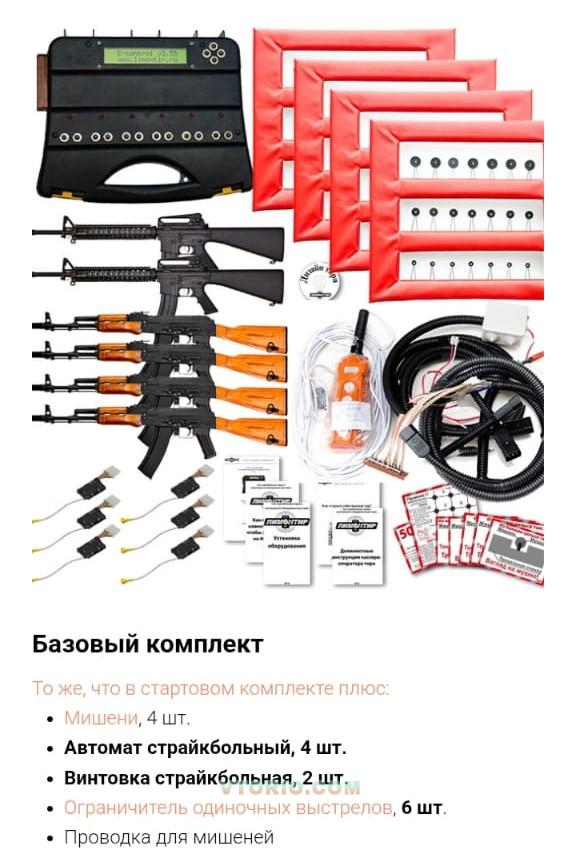 6 макетов автоматов, пульт управления ими, 4 мишени управляемые с помощью пульта. Для работы необходимо питание 12 вольт (аккумулятор или блок питания) - Пульт управления с озвучкой (можете сами загрузить любую озвучку- музыку, выстрелиы и т.д.): Ведет учет каждого выстрела Перезаряжает привод одним нажатием кнопки Привлекает прохожих звуковой рекламой и озвучивает выстрелы (дополнительный модуль) Кнопка аварийного отключения оружия Показывает количество оставшихся выстрелов на каждом из 6 мест Страйкбольные привода : 4 АК 2 американские винтовки Внешне являются копией настоящего оружия Безопасны для жизни и здоровья Разрешены к свободному обращению в РФ, Казахстане, Украине, Беларуси Заряд на 600 пластиковых шаров Мишени: Разные размеры целей будут интересны как начинающему, так и профессионалу Автоматический подъем мишеней по нажатии кнопки Клиент сам видит свой результат Удобны для соревнований Тир покупался у производителя - Лимонтир, эксплуатировался только летом в сезон