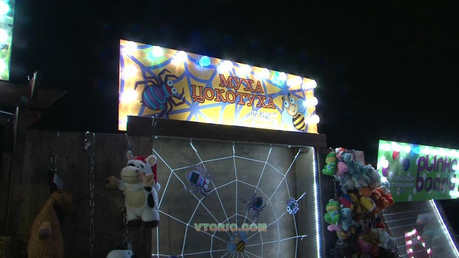 Применена цветная быстросъемная верхняя вывеска; использована ламинация, размер вывески 150х50, большое количество кабошонов Итальянского производства, LED лампы RGB высокого качества с нанесением силикона для уверенного использования аттракциона на улице в любую погоду и времени года. Лампы и кабошоны прозрачного цвета, однако вывеска светится всеми цветами радуги не повторяя комбинации в течении 7-10 мин. Кроме того, если Вы подключите сразу несколько наших аттракционов в одну линейку, то все вывески будут работать одновременно, в одной свето-цветовой гамме, эмитируя один большой развлекательный комплекс. Это уникальная разработка наших программистов. Вы будите очень выгодно смотреться на фоне Ваших неброских конкурентов!!! Это естественно положительно отразиться на Вашем доходе и результат не заставит себя долго ждать!!!